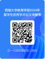 1. 申请者请在线填写《西南大学必赢3003no1线路检测中心2024年留学生优秀学术论文申报表》(网址:https://www.wenjuan.com/s/i2QBfyq/# 或扫描以下二维码填写),并按要求上传论文附件(包括期刊封面、目录、论文全文,如未正式发表请附接收函,PDF格式)。