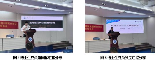 第三项,博士生党员代表汇报分享。随国栋同志分享了走向意义学习的课例研究,分别从课例研究的时代境遇、基本要义以及操作路径三大方面进行阐述,探索了“以学为中心的教学变革”和“走向意义学习的课例研究”。张玉同志系统地梳理了文献研究法的概念内涵、使用方法及注意事项,重点论述了文献综述的写作方法与成果转换,以及探析了文献研究过程中“读不进”“记不住”“想不开”三大困惑的应对之策。李健同志通过对艺术美育的内涵本质、现实困境和未来途径的系统揭示,让大家对艺术美育有了更深刻的思考。