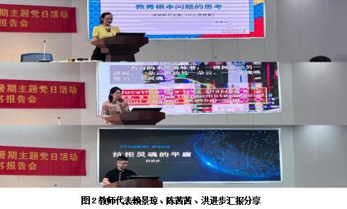 第二项,教师代表汇报分享。每组选取一位教师代表分享读书心得和小组交流成果。第一小组代表赖景琼教师从教育的根本问题入手,以己观书,以书观己,分别以人的生成论、人的陶冶论、人的超越论为基础为“为谁培养人”“培养什么人”“如何培养人”等关键问题提供了新的阐发。第二小组代表陈茜茜教师就“如何读”这一问题,结合时代背景展开对“教育的变与不变”的思考,从一本书引出了多本书,深刻地探讨了教育的本质。第三小组代表洪进步教师从著作和教学实践出发,提出“抗拒灵魂的平庸”中心观点,带领大家思考教育视域中灵魂与精神的问题,并在此基础上阐述了其理想的教育样态。