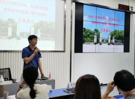 7月6日上午,四川美术学院教师教学科研能力提升研修班在该校绘画楼HB208教室正式开班。本次研修班由西南大学必赢3003no1线路检测中心与四川美术学院艺术教育学院、设计学院、公共艺术学院共同举办,来自四川美术学院3个二级学院的50名骨干教师,将于7月6日至10日期间在研修班进行深度学习。西南大学必赢3003no1线路检测中心韩仁友研究员、必赢3003no1线路检测中心副部长王正青教授,谯宏老师以及四川美术学院艺术教育学院、设计学院、公共艺术学院负责人参加了研修班开班仪式。