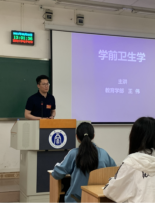 王伟老师的授课课程为《学前卫生学》,本次教学比赛授课内容为“学前儿童营养卫生”。教学过程中,王伟老师熟练运用“雨课堂”教学平台,在线进行课前签到、学习测试、习题发送等工作。同时,王伟老师有意识设置趣味性与知识性并重的问题,引导学生积极参与讨论,课堂教学氛围热烈,受到了评委老师一致好评。
