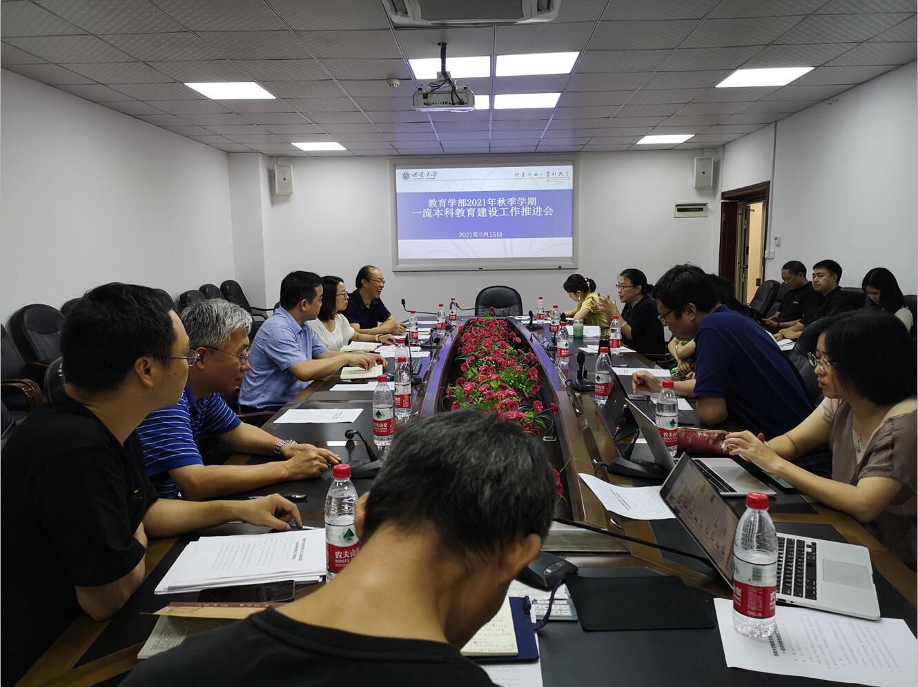 2021年9月15日下午,学部2021年秋季学期一流本科教育建设工作推进会在田家炳教育书院403会议室召开。学部党委副书记刘娇老师、副部长王正青教授、教学指导委员会主任委员范蔚教授、教育学院院长么加利教授、院长助理吴叶林老师,学前教育学院院长李静教授、副院长胥兴春副教授,特殊教育学院院长赵斌副教授、副院长李欢副教授,教育技术学院院长刘革平教授、副院长余亮副教授、副院长邓晖副教授,教育研究院院长唐智松教授,教育实验中心主任陈本友副教授,团委书记李晶晶老师,教学工作办公室主任田京巾老师,辅导员杨岗老师,本科教学秘书胡熔老师等参加了本次工作推进会。会议由副部长王正青教授主持。