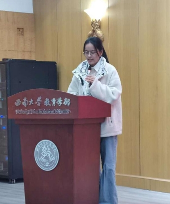 接下来是学生代表发言。2023级实习生代表学前教育专硕许情雁向学弟学妹们分享了她的实践经历,并给学弟学妹们提出三点建议:一是要适应角色的转变,充分储备专业知识;二是要加强责任意识,认真对待每一项工作任务;三是要形成成长型思维,坚持撰写实习日志,及时总结与反思。