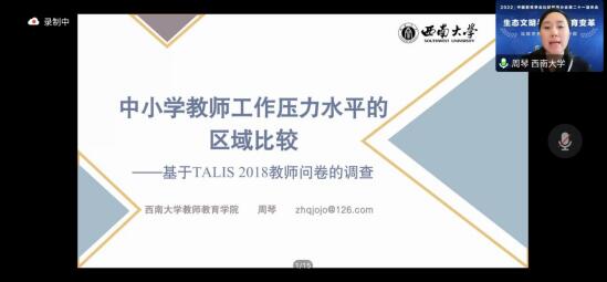 在分论坛七“生态文明背景下的国际教师教育新进展”上,周琴教授以“中小学教师工作压力水平的区域比较——基于TALIS 2018问卷调查”为题进行发言。周琴教授阐述了研究设计,分析了西南四省中小学教师工作压力水平的总体特征,并与上海、OECD平均水平进行比较分析,提出了减轻中小学教师工作压力的建议。