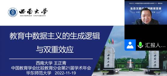 王正青教授主持了11月19日上午大会报告的后半场活动,并在教师分论坛八“中国比较教育学科建设的使命与前瞻”中进行发言和点评。在“教育中数据主义的生成逻辑与双重效应”报告中,王正青教授揭示了数据主义的内涵意蕴,解析了数据主义的生成逻辑,指出了数据张扬双重效应,并针对负面效应提出了规避之道。
