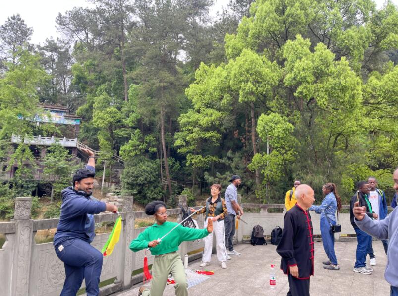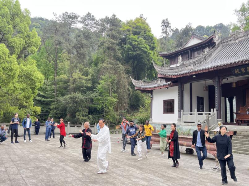 The learning activities were rich and diverse, including Tai Chi culture, sword dance, Taoist factions, Taoist etiquette, historical figures, Taoist contributions, etc. Two Taoist temples were visited during this event, i.e. Shaolong Temple and Baiyun Temple. The team first arrived at Shaolong Temple. The Taoist leaders who also led people of Shaolong Temple expressed a warm welcome to the students, and introduced the origin and faction characteristics of Shaolong Temple. Subsequently, he also guided the international students to visit and experience the characteristic Taoist cultural activities such as Tai Chi exercise, sword dance, science and technology museum, etc.. Students also learned about the five kinds of tributes: "tea, incense, lamps, flowers, and fruits", learned and experienced the Taoist etiquette of "three worships and nine knocks", and had a preliminary understanding of the Taoist medical system, and personally felt the characteristic culture of Taoism.