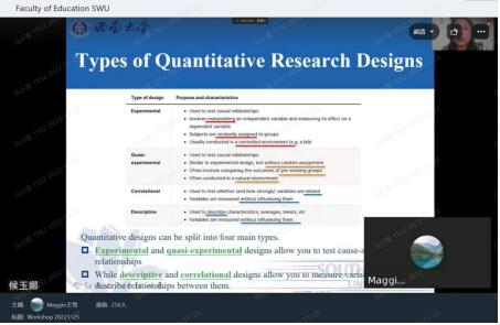 2022年 11月25日下午,西南大学必赢3003no1线路检测中心在线举办了“中外教育互鉴学术工作坊”第二期活动。 本次工作坊由侯玉娜副教授主讲,报告题目为《量化设计与方法在教育研究中的应用:案例分享与数据分析》。本次活动的嘉宾有全英文教研室王雪主任、留学生班主任李雪垠博士和周玲博士,活动由王雪主任主持。鉴于首场学术工作坊活动的良好反响,学部积极推进资源共享,通过钉钉平台线上同步直播互动。本次活动共计有300余人参加,包括学部留学生、硕博研究生和外校学生。