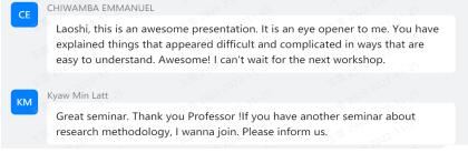 会后,留学生同学们纷纷表示,本次量化研究学术工作坊,让他们受益匪浅,很多二、三年级的研究生谈到,在疫情期间大家正在为如何收集研究数据等发愁,侯老师的工作坊给予了很好的方法论指引,提供了非常有价值的数据库,讲授方式深入浅出,并表达了对下次工作坊活动的期待和盼望。