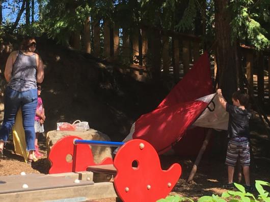 随后,大家又参观了该中心供幼儿户外活动的园区。中心关于幼儿户外活动的环境创设理念主要是遵循自然,类似于我国的“安吉游戏”实践,其园区创设充分体现出自然开放性和探索性,能够吸引幼儿不断去探索发现。在户外活动园里,孩子们更乐于选择自然的材料,相对地,教师也需要对幼儿进行遵循自然的户外活动引导。在关于幼儿的户外探索目的性的讨论中,同学们和杨老师进行讨论后认为该幼儿园的课程模式作为一种方案教学,很好地以儿童的兴趣为基础,引导幼儿探索自己的课题。其中,教师的引导策略和技巧非常重要,否则很容易使幼儿的探索变成毫无目的的玩耍。
