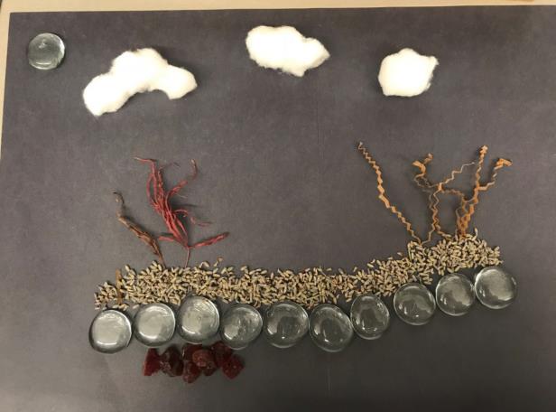 教学活动中,同学们依然采用分组合作学习的方式,互相扮演教师,引导同学扮演的幼儿根据在“故事垫子”教学活动中创作的作品进行思考,即,自己创作的作品发生了什么故事,由此形成一个具有完整结构的故事。同学们在课堂上充分发挥主动性和创造性,模拟体验教学过程。如在李勰扮演幼儿角色和蒲阳扮演教师角色的合作学习小组,“教师”引导“幼儿”利用棉花、石头和树叶等材料的细节进行故事创编,记录下了一个关于奇妙旅行的故事(A Fantastic Journey)。大家合力将这个精彩的记录了下来。