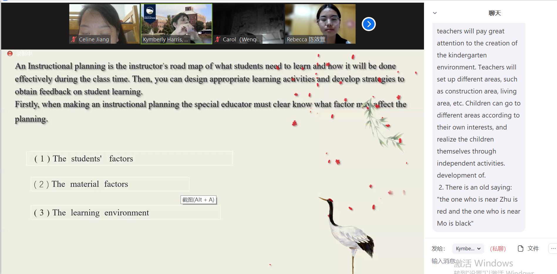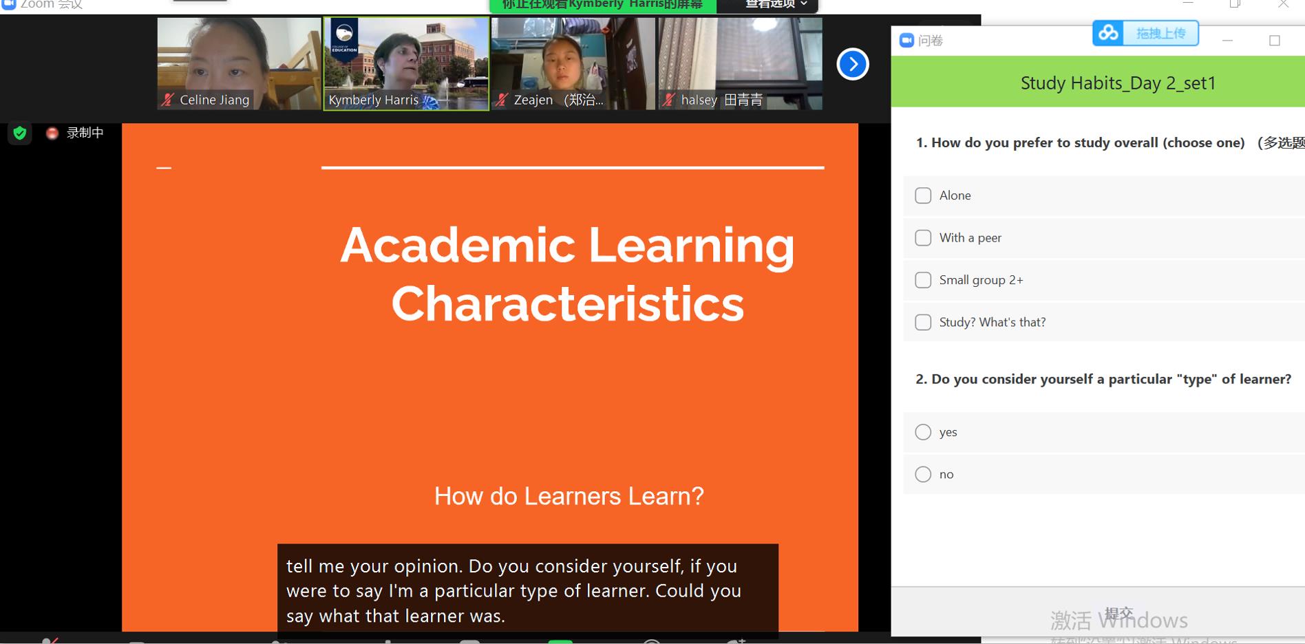 7月12日晚8点,《教学和行为管理方法》课程正式拉开序幕,Harris教授先向同学们做了简单的自我介绍,接着了解同学们的基本情况,在与同学们相互熟悉过后,Harris 教授开始了正式的授课。本次课程主要围绕着“特殊教育新教师标准”开展,Harris 教授主要介绍了特殊需要学生的发展特点、学习环境、课程知识、评估、教学计划和策略、专业学习与道德实践,合作7个方面展开。在课程中同学与Harris 教授积极互动,在课程课程末尾,Harris 教授总结本堂课的主要内容,并对同学们提出的问题进行解答。通过堂课的学习,同学们了解美国特殊教育的教师标准,对于特殊教育儿童的特点和学习需要有了更多的了解,同时对于自己的未来的职业方向专业发展有了更清晰的认识。