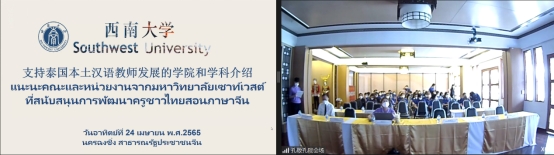 国际学院留学生招生办王鹊老师通过视频和PPT向泰方教师扼要介绍了重庆和西南大学的基本情况,重点讲解了国际中文教师奖学金申请和选择西大的四大理由,即生活费标准在重庆“价值更高”、预录取授予率超96%、合作项目名额优先投放、“一带一路本土汉语教师提升项目”优先支持。