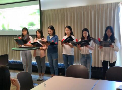 接下来进行的是汇报环节,西大的队员们分成5组进行了本次访学学习心得的总结汇报。第一组同学进行了自由主题汇报,将他们在访学期间的所见所闻进行了总结整理,内容准确清晰。第二组的同学根据学习内容,进行了“Discovering Nature:Playscape for children”的主题汇报。关注室外环境的自然元素,同时以重庆某幼儿园为例,介绍了中国幼儿园户外场域的建设情况。第三组同学以美国学习生活总结为主题,将三周的学习和生活进行了总结,同时还别具匠心,改编英文版的《SWU-WWU友谊天长地久》,美妙的歌声打动着在场的每一个人。第四组同学以“Multicultural Education in China”为主题进行了汇报,显示总结了课程中学习到的多元文化教育方面的知识,同时结合中国“多民族教育”现实,以壮族为例,介绍了目前壮族对于民族文化的传承和教育。第五组的同学就“Helping Children Connect with Nature”进行了汇报,从环境创设、活动开展、教师角色三方面讨论如何帮助幼儿与自然进行联系。另外还创编了一首与主题有关的小诗现场朗诵,更为生动地诠释了主题。队员们学习态度认真,汇报内容充实,呈现形式多样,得到了两方老师的充分肯定。