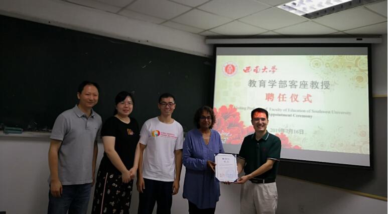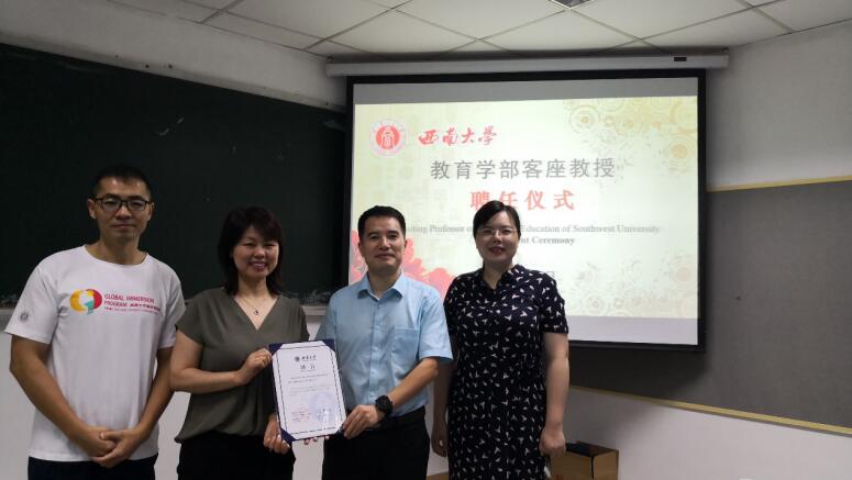 在国际课程周期间,经学校评审,Li Cao教授、Kumari K.Beck副教授和Zhihua Zhang副教授获聘西南大学客座教授。学部为三位老师举行了简短而隆重的聘任仪式,王牧华副部长分别为三位老师颁发了聘书,感谢三位老师对国际课程的支持与付出,并希望能由此进一步开展多方面的合作。三位老师感谢学校和学部对他们的重视与信任,纷纷表示会尽自己之力支持学部的国际化工作,也希望作为桥梁推动学部与他们学校的进一步合作。