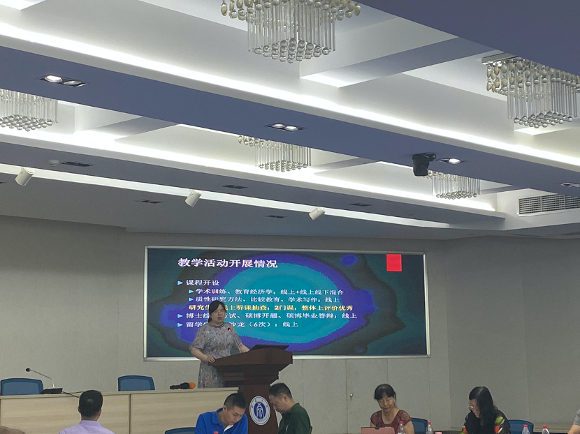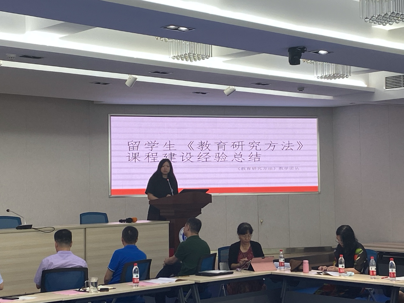 在全英文课程建设方面,唐小为副教授代表《教学研究方法》课程团队进行了发言。唐老师分享了《教学研究方法》课程在目标设计、教材选用、课程大纲制定、教学设计等方面的经验。唐老师指出,全英文课程必须要结合留学生群体的特征和经历背景来设计和实施,在教学过程中结合教学内容增加相关的案例分析和参与性活动,有助于提高课程的针对性和有效性。同时,科学合理的评价设计也是保障教学目标得以实现的有利措施。