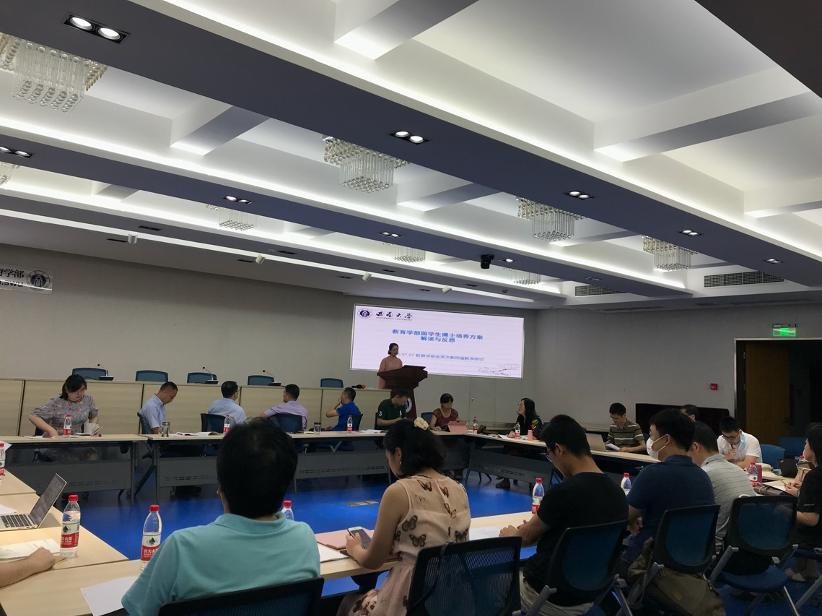 随后,会议进入研讨环节。钟婉娟副教授对2019年修订的全英文专业博士培养方案进行了详细的解读。她对培养方案的板块要点进行了逐步的解析,解读了设计的背景和缘由,以及培养方案中新增的要求点和亮点。同时,对培养方案细化实施也进行了初步的思考,对留学生综合考核、学术成果培育机制等提出了有益建议。