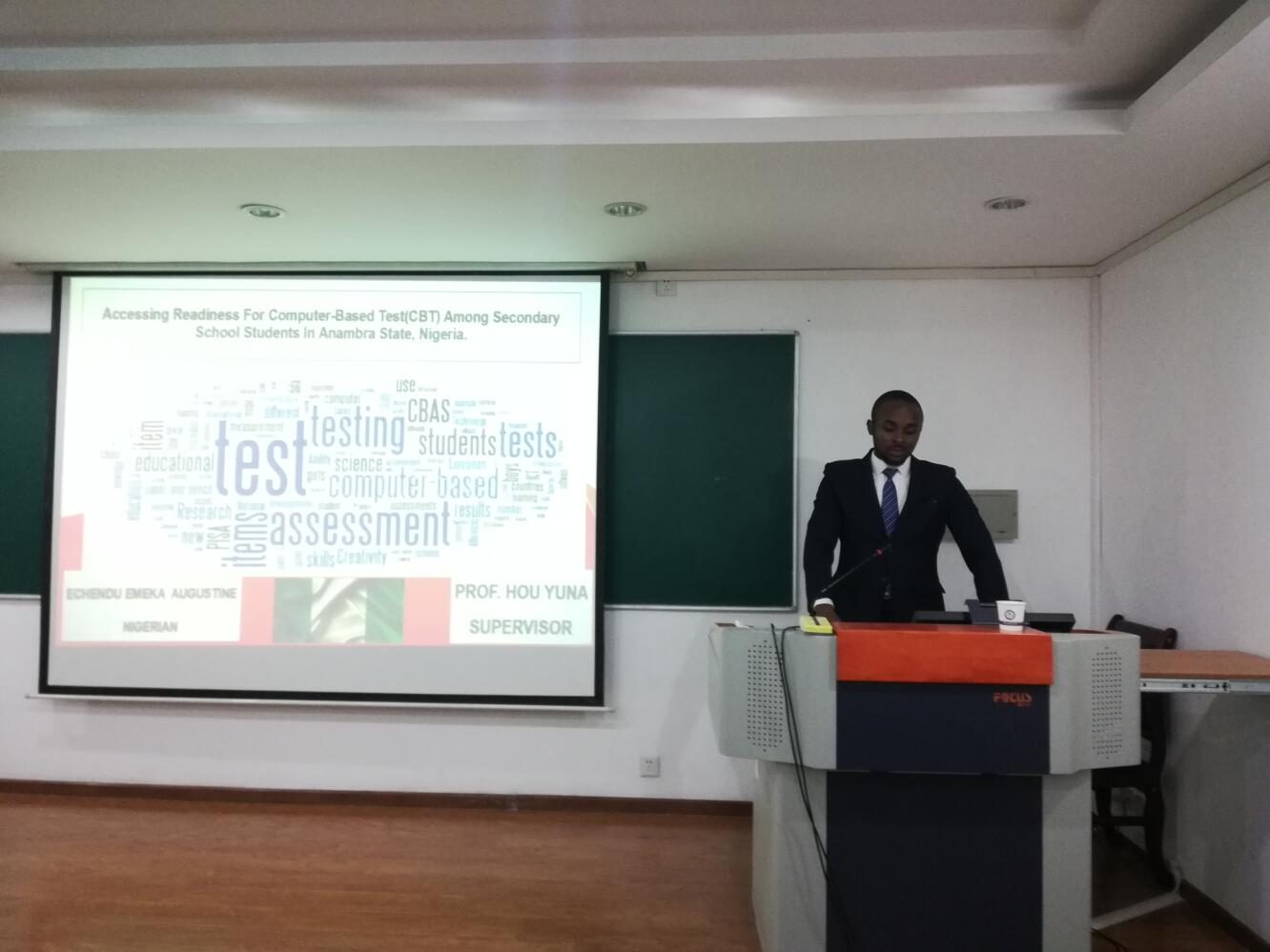 其次是18级硕士生Echendu Emeka Augustine进行报告,他的论文题目为“尼日利亚阿南布拉州中学生基于计算机测试的准备情况”。通过对研究目的、概念界定、研究方法、框架分析等一系列的阐述,指导老师认为用量化的研究方法测量技能的提升具有一定的难度,并建议需要建立清晰明确的研究框架。