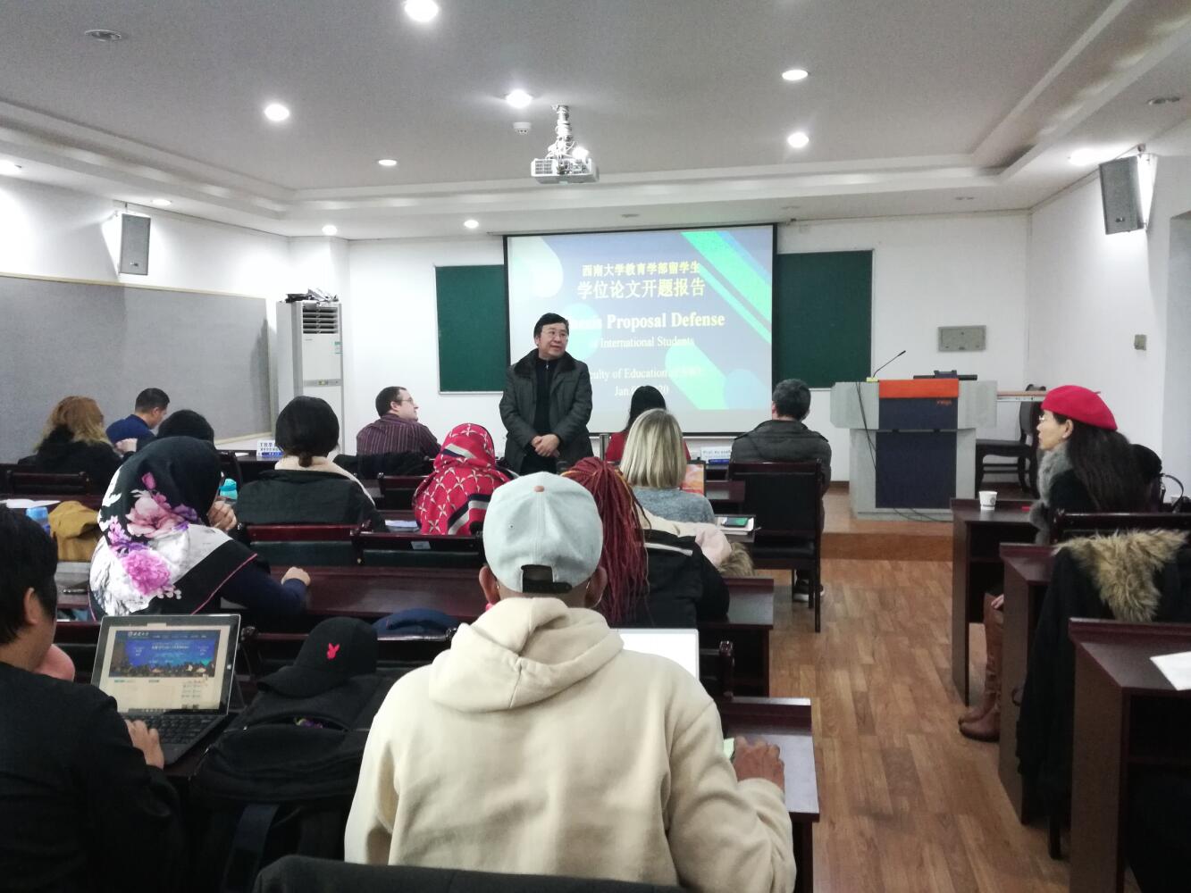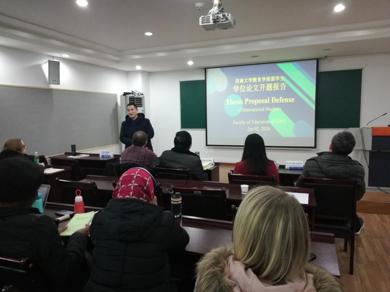 2020年1月2日下午,在必赢3003no1线路检测中心502室,2018级全英文留学生举行学位论文开题报告会。主席为徐辉教授,委员由王牧华副部长、徐学福教授、彭爱辉副教授和F.W.stonier副教授担任。班主任周玲老师主持报告会,18级和19级部分留学生参与聆听。