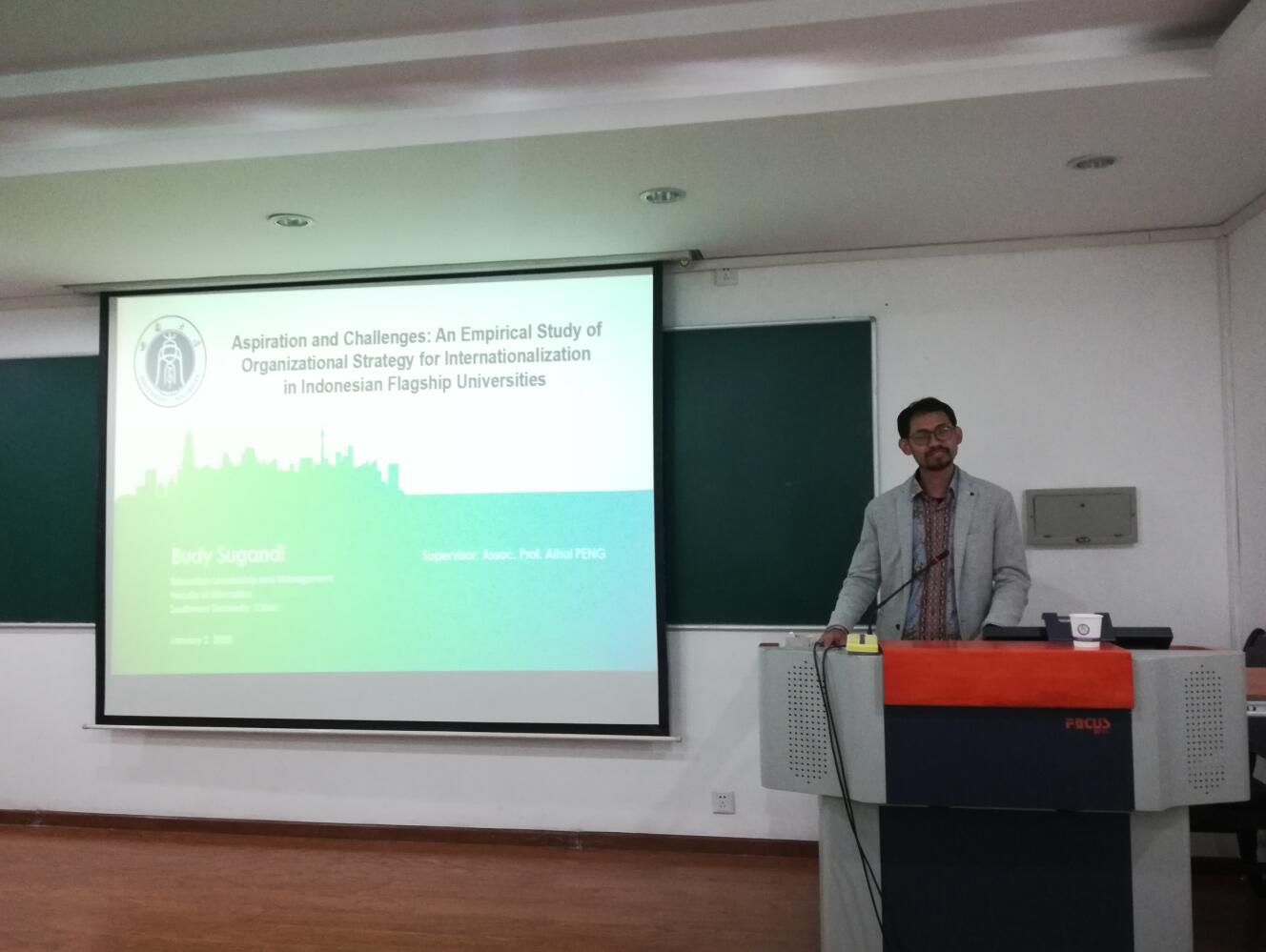 首先是18级博士生Sugandi, Budy进行汇报,他的选题是“印度尼西亚旗舰型大学国际化的组织策略研究”,向在场的各位介绍了其选题缘由、背景信息、文献梳理、研究内容与方法等多方面内容。指导老师多就其论文中定义不清晰的问题提出相关建议,并指出思考如何将研究问题与研究内容更紧密的结合起来。