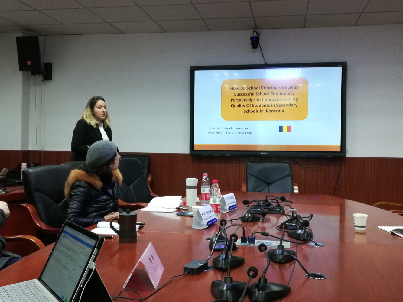 最后汇报的是来自罗马尼亚的Gabriela Loredana Nebancia,18级教育经济与管理专业硕士,她的研究主题是“如何使校长成功发挥校内交流伙伴关系,以此来推动罗马尼亚初级中学的学生学习质量”。徐学福教授认为校内交流伙伴关系是一个长期被讨论研究的话题,他建议可以将本论文的研究问题聚焦,使研究重点更加突出。