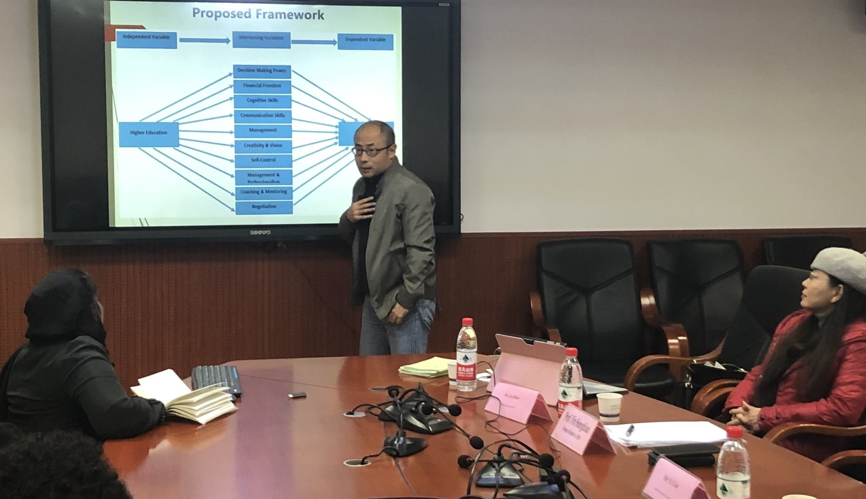 第一位汇报者是2018级教育领导与管理专业的Sumara Mehmood,她以本国巴基斯坦为例,探讨高等教育与女性领导者领导能力建设之间的联系。刘屹老师首先提醒同学们改进汇报的技巧,然后指出该论文的题目过于宽泛,需要找到最核心最重要的研究问题进行聚焦。尹弘彪教授和其他同学针对其“总-分-总”的论文框架产生了不少疑惑,其中“分”的部分,“中介变量”多达10种,尹老师建议Sumara聚焦某一或某几个变量,重心落在要研究的主要问题上而不是中介变量上,重新思考一下论文框架。