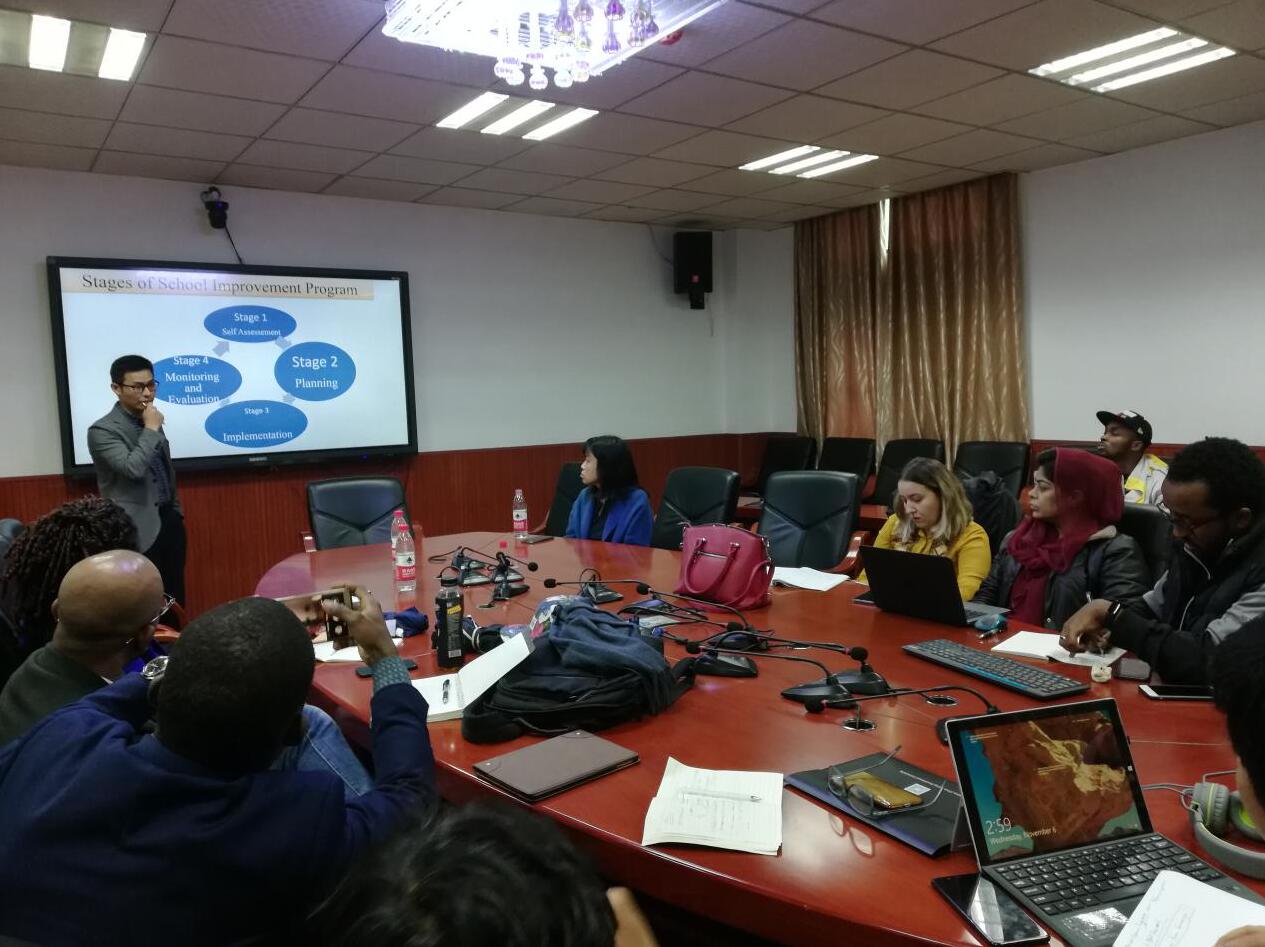 首先,来自埃塞俄比亚的二年级博士生Tadesse, Endale向大家展示了他博士论文的主要内容,对于学校发展性教育质量的研究。他将发展性教育质量分为四个维度进行阐述分析:教师发展、课程教材评估、管理部门、学校发展,并进一步地构设出学校发展的理想框架。随后,在场的其他留学生同学向Endale提问其选题缘由,并给出建议如果是自己做这个研究将会以怎样的视角去剖析。
