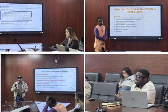 活动伊始,哈萨克斯坦的Tandagul Birlesbek同学作了主题为哈萨克斯坦文化教育的学术汇报。首先,她对哈萨克斯坦的多元文化以及多元文化教育进行介绍,并在此基础上总结多元文化教育对哈萨克斯坦发展的必要性。然后,来自塞拉利昂的Alimamy Kargbo同学从多元文化教育的发展、塞拉利昂的国家概况、全纳教育、宗教教育等对塞拉利昂多元文化教育现状进行汇报。胡老师在点评时建议适当补充背景信息可以使汇报结构更加完整,并且在汇报时应聚焦汇报主题,有所侧重,可以使学术汇报更明确。