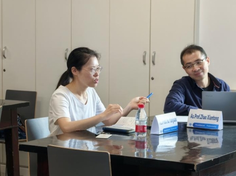 接着,Jecha Suleiman Jecha同学进行了以混合式学习环境下学生在线求助与拖延行为的关系为主题的汇报,研究对数据库中的相应主题的文献进行内容分析,聚焦于在线求助与拖延症的关系,并强调其中学习动机、自我调节和课程难度的影响,并基于此谈论今后的研究选题方向。最后,Tandagul Birlesbek同学采用混合研究方法,以探讨中国高校中哈萨克斯坦研究生面临的挑战与应对策略为主题进行了研究设计并进行汇报。汇报完毕后,胡老师与赵老师就如何让宽泛的选题更具针对性,以及如何结合自身研究目标选定合适的研究方法,与两位同学展开了探讨。