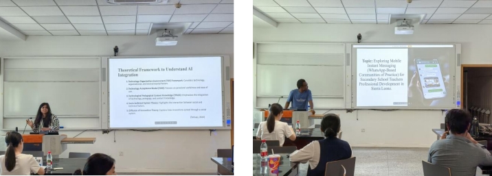 活动伊始,Laiba Malik同学作了主题为“巴基斯坦高等教育机构对生成式人工智能的认知和所做准备”的学术汇报,从生成式人工智能定义、作用及影响展开,进而谈到巴基斯坦高等教育中人工智能现状及其所面临的挑战。然后,Alimamy Kargbo同学聚焦于塞拉利昂实时通讯应用(基于whatsapp应用软件)对中学教师专业发展的影响,从研究背景、问题提出、研究目标、理论框架、核心概念界定、研究结果、研究结论及意义等方面进行汇报。胡老师在点评环节首先肯定了汇报主题的独特价值和框架的完整度,同时建议在研究过程中着重思考如何让研究背景更具论证力度,以及如何构建严谨的理论框架体系。