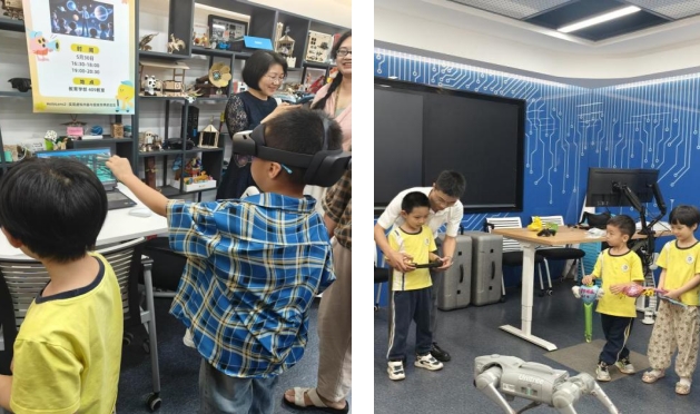 活动当天现场氛围热烈,孩子们纷纷踊跃参与到8个趣味十足的创客项目中。在409教室,多个项目精彩纷呈。“我是神枪手”中,3-4名参与者开展多人PK,借助程小奔的小程、慧编程软件模拟射击,在趣味中培养了孩子们的专注力。“看谁跑得快”中,根据学生水平准备不同难度的数学口算卡片,分配计算员、程序员等角色后,领取mBot2基础版机器人,让学生在解决数学问题的过程中,锻炼逻辑思维与团队协作能力。“魔法视界”利用AR眼镜引导孩子们按提示完成使用任务及指令,虚拟与现实的互动为孩子们带来了前所未有的沉浸式体验。此外,“叶脉印画”也深受喜爱,孩子们纷纷让家长用手机上传图片,再通过激光雕刻机将照片打印到树叶上封存。机器狗互动环节同样人气高涨,孩子们争相尝试遥控操作,在科技体验中收获欢乐。