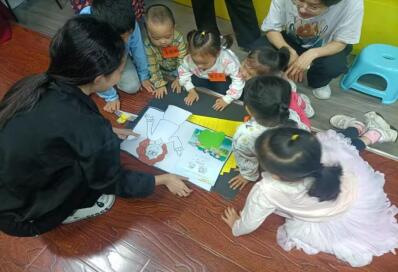 活动结束后,小朋友们围坐在一起进行剪纸的“拼拼拼”,来加深对变焦的理解。从小的荷叶到老师讲课再到学校,从小变到大,将小朋友们的视线从局部拉到全局。小朋友们可真是拼图高手,没几下就把一幅画完完整整地呈现在大家眼前了!