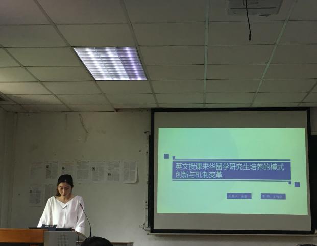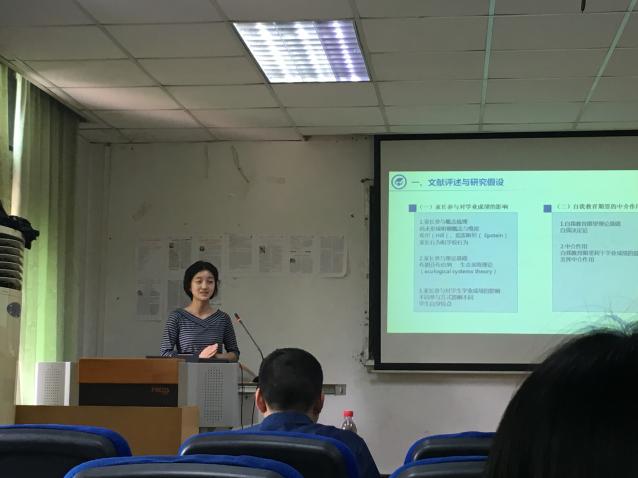 活动伊始,主持人马逸宁同学向大家介绍了担任本次比赛的评委老师和参赛选手的基本情况,并对本次竞赛的流程和规则进行了说明。选手们按顺序依次上台对论文成果进行汇报展示。选手们主要从问题提出、研究设计、研究方法、研究结论、对策建议等方面对论文进行分享。参与本次比赛的同学选题涉及广泛,研究方法多样。其中,王一同学基于计划行为理论视角,采用课堂观察和深度访谈的方法探究小学生课堂沉默的影响因素。罗颖同学采用知识图谱的方式对当前我国多元文化课程研究的内容进行了分析,并依据当前研究现状提出未来研究的展望。涂毅同学以数据分析的方式探讨了英文授课来华留学生的模式创新与机制变革,深刻论述了“双联双促,三级共建”的培养体系。