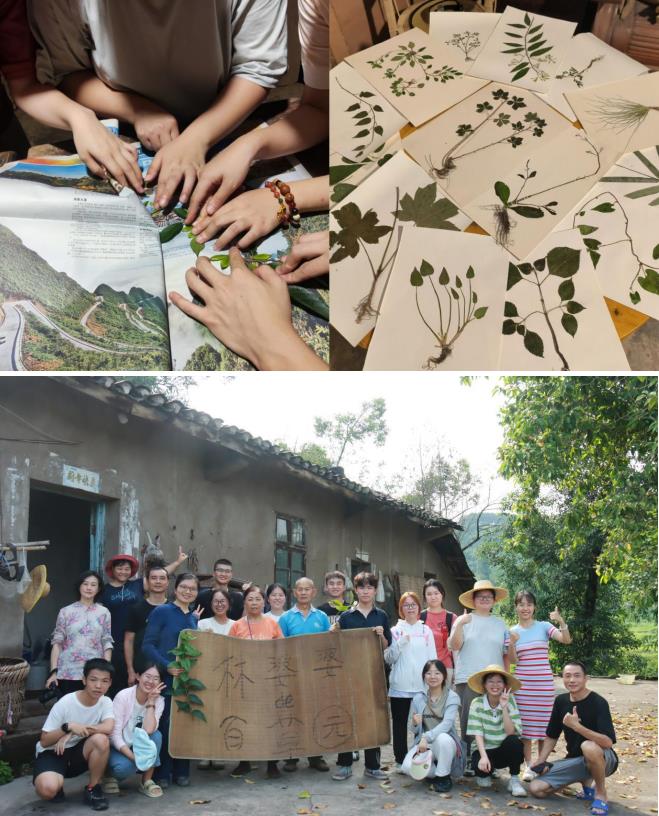 团队特邀重庆自然博物馆科学研究部陈锋老师、缙云风物自然教育工作室创办者张诺诺老师开展植物标本采集、制作、摄的理论培训并持续陪伴实践活动。在实地探访阶段,实践团成员齐头并进、分工明确、各有所职,访谈、摄影、采集有序进行。“凡胎俗骨”的路边野草正是林婆婆手中救人无数的灵丹妙药,看似寡言少语的林婆婆在回忆起过去时也是滔滔不绝。图鉴制作阶段,实践团也井然有序地进行每一步骤,摄影、修剪、压制、烘干、缝制,简单的标本背后是繁杂的制作程序。