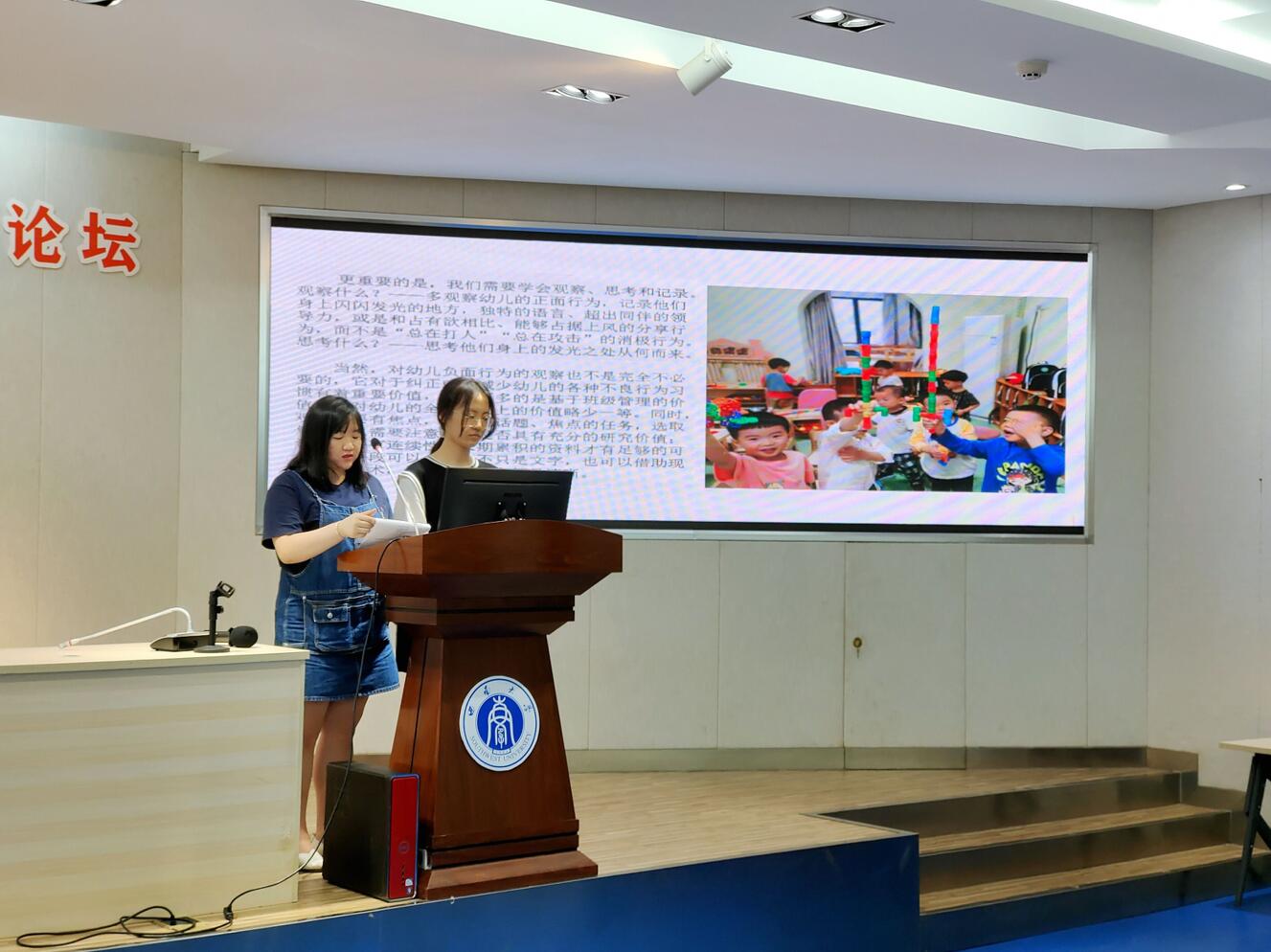 首先,学前教育师范班的实习同学分别从园所介绍、实习挑战、实习收获、感悟与反思等板块进行汇报。江津区鼎山幼儿园的同学以“知行合一、学思并举”作为其实习主旋律,在实习中兢兢业业、上下求索,提升自己的环创经验也丰富教学体验,并提出“道之所在,虽千万人吾往矣”的教育宣言;几江幼儿园的同学在实习中有欢笑有泪水,通过实习活动,获得挑战新事物的底气和力量,锻炼自己成为合格的幼儿园教师;西南大学实验幼儿园的同学们面对实习中的困难不气馁、不妥协,克服教育理论与实习经验的隔阂,解决了一个又一个实习难题;渝北幼儿园的同学收获知识,迎接挑战,从“小白”教师蜕变成得心应手的专业人员,开展了《建筑师杰克》《认识薄荷》《情绪小怪兽》等精彩的教学活动;渝中实验幼儿园的同学们在幼儿园“人和至爱,谐以养正”的办园理念的影响下,转变教育视角,上能将半日活动组织得风生水起,下能班级保育安排得井井有条。