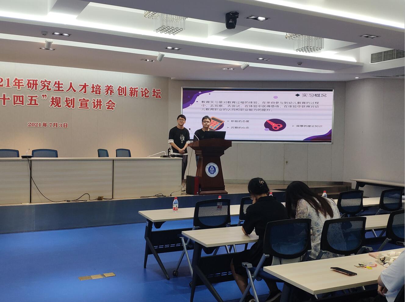 接下来,学前教育班实习同学分别汇报了实习生活经历。北碚缙云幼儿园实习小组代表从保育工作、教学活动、教研工作、特色主题活动、环创工作、小组研讨活动六个方面总结了实习经历;北碚实验幼儿园实习小组介绍了幼儿园的历史、办园理念、课程理念与教育模式等,阐述了实习的经历与收获会伴随一生,成为人生路上一份无价的珍宝;江北新村幼儿园实习小组分享了他们的成长与变化,并从环创主题、色彩搭配、材质选择、环创内容等方面阐述了受到的启发与自身的不足;渝北庆龄幼儿园实习小组代表从幼从专业理念、专业认知、专业技能和职业规划等方面总结了实习的收获,最后发出对学前教育真谛的思考。