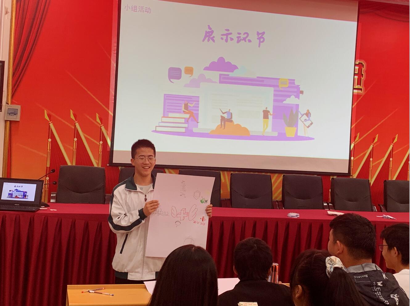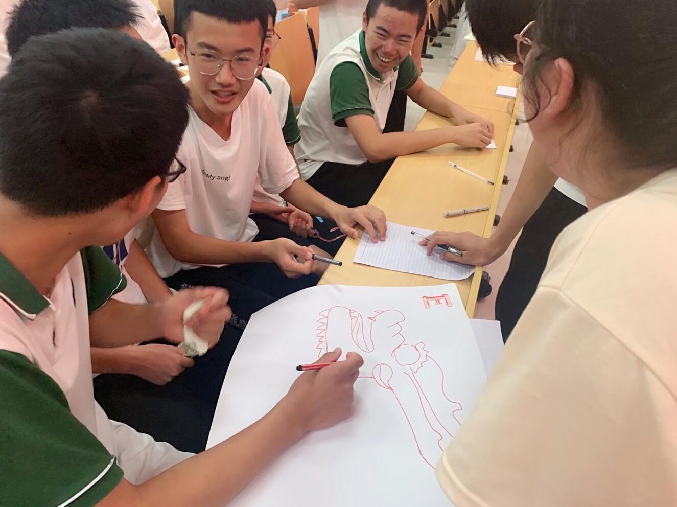 为引导学生进一步理解自己在测试中的选择,李偲将学生分成6个不同的小组,代码组合中首字母相同的学生为一组,制作相应的岛屿海报。学生们兴致勃勃,积极交流讨论,精心设计所在小组的海报。到小组展示环节时,学生们纷纷踊跃上台展示自己小组设计的海报,并讲解其蕴涵的寓意,台下的学生为展示小组的奇思妙想鼓掌,现场气氛达到高潮。