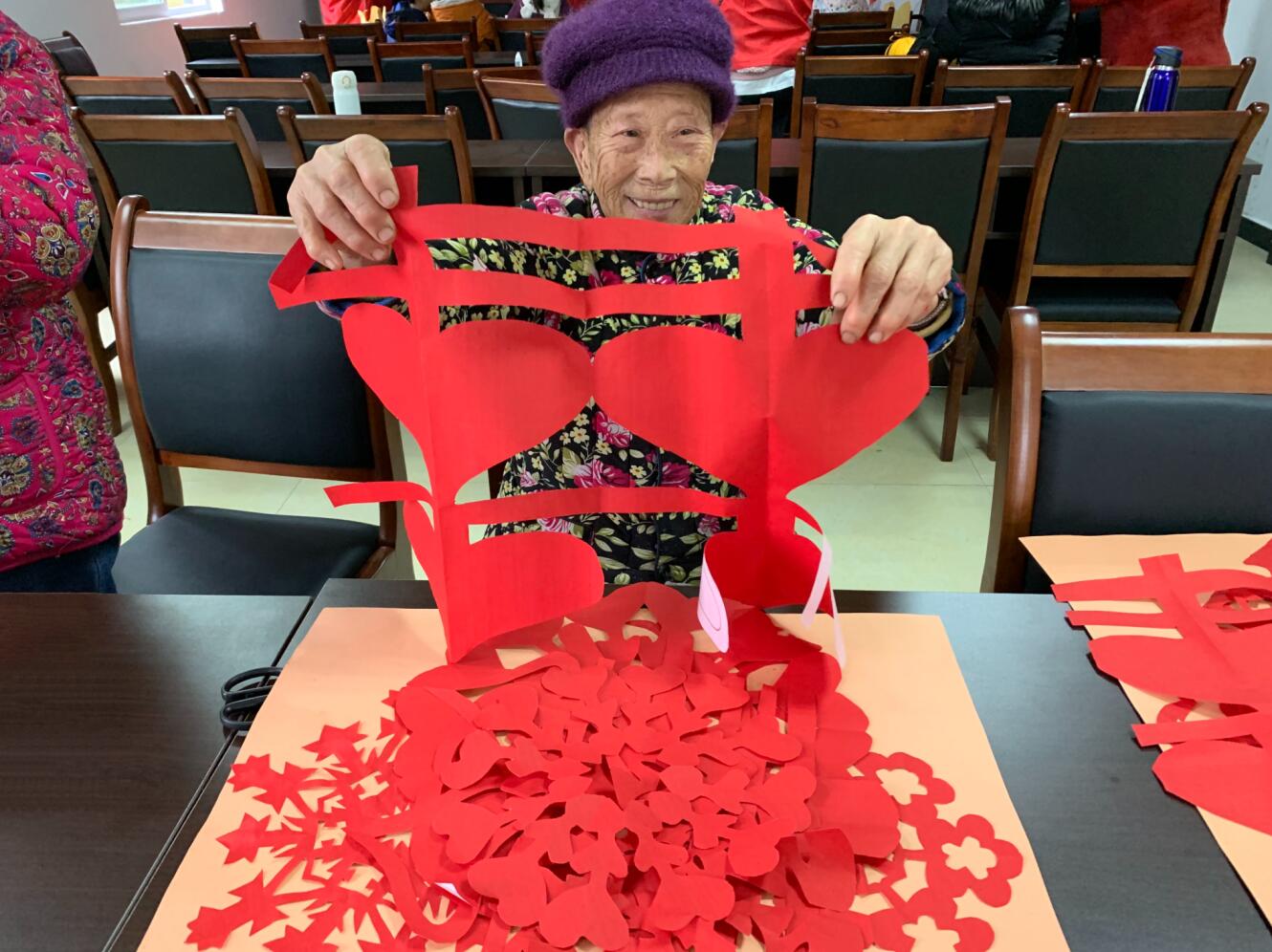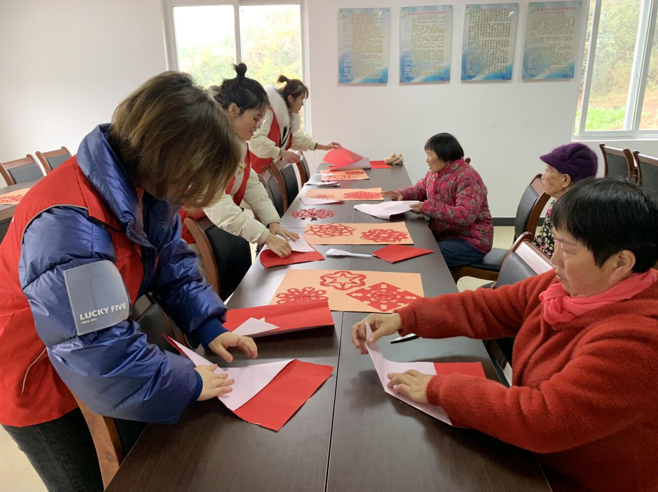下午,实践团队组织东山村的空巢老人们到村居委会参加“年俗文化之剪窗花”的活动。在前期的观察调研中,实践团队了解到村里的空巢老人们都已年过半百,本着传递快乐的团队理念,决定将帮扶对象扩大到村里的空巢老人。尽管老人们年事已高,行动不便,但还是很积极地参加到活动中来。在与老人们摆谈的过程中,实践队员听说徐奶奶的孙子即将迎娶媳妇,于是提议教她剪“囍”字窗花。