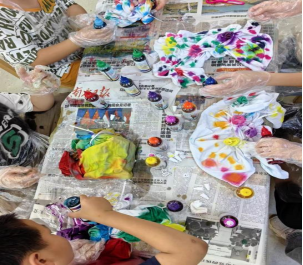 孩子们戴上手套,套上围裙,用布、绳、颜料等工具,在实践队员的指导下,通过缠绕、折叠、扭曲等不同手法在白色T恤上绘就出独有的纹路,体验造物的神奇魅力。扎花、浸润、上色、晾晒,每一个环节都充满了乐趣。