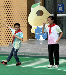 红的、白的、黄的、蓝的、绿的……孩子们穿上自己创作的唯一独有的扎染服装,演绎了一场欢乐的T台秀。孩子们两两一组,大方地展示自我,或俏皮、或呆萌、或冷酷,秀出欢乐的风采。