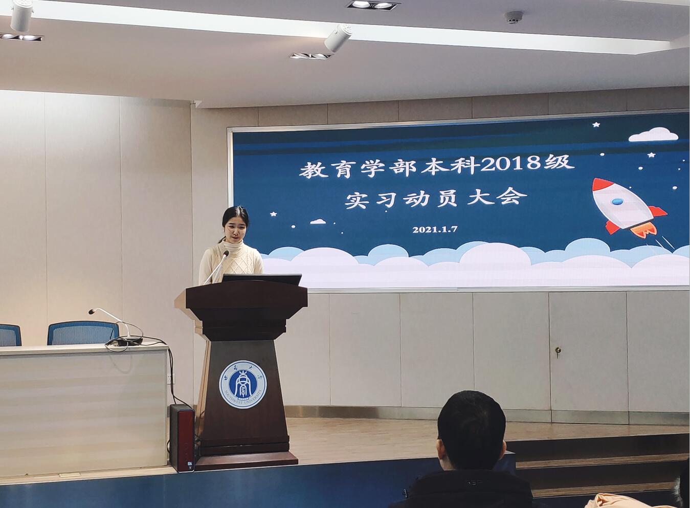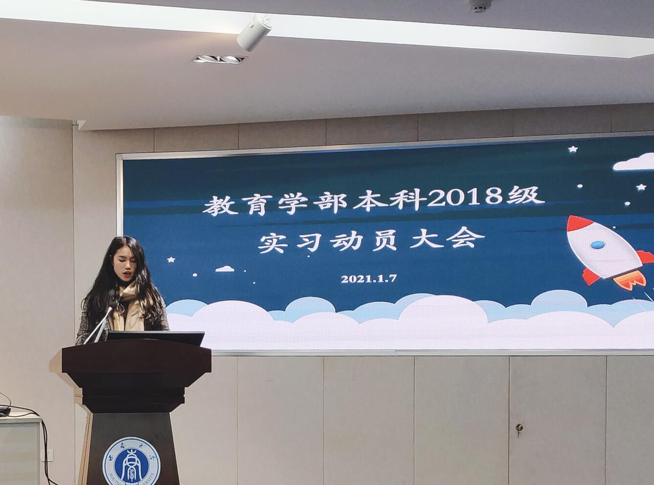 最后,本科2018级学生代表,来自特殊教育专业的刘远秋同学发言,代表全体即将迈入实习岗位的同学表态:必将在实习中“端正态度,精勤求学”、“要严于律己,做好角色转变”、“致知力行,踵事增华”,希望大家能趁此机遇笃行不怠,接受实习的洗礼,勇敢地向教育梦想进发。