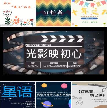 为深入贯彻党的二十大精神,回顾十年来特殊教育的发展历程,扎实推进特殊教育专业人才培养,12月24日晚7点,2022级特殊教育师范专业全体本科生在江小英老师的组织带领下开展云上微电影首映礼活动。出席此次活动的老师还有本科2022级辅导员李晶晶老师、班主任杨璇老师以及李雪垠、凌东山、贾添天、赖松等几位老师。此次活动特别邀请南川区特殊教育学校唐毅校长、北碚区特殊教育学校王均校长、陈群副校长、甘国贤老师和蒋静老师。特别感谢北京师范大学、华东师范大学、新疆师范大学、滨州医学院师生的关注和观摩。