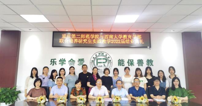 初夏之际,西南大学必赢3003no1线路检测中心与重庆第二师范学院联合培养研究生实践教学项目迎来了收尾。6月16日,2022届结业典礼在重庆第二师范学院南山校区三教楼3503会议室举行。出席本次结业典礼的有西南大学必赢3003no1线路检测中心副部长彭泽平教授、张骞教授、研究生教育秘书秦荣芳、教学工作办公室主任田京巾、南坪实验幼儿园园长杨再慧、重庆第二师范学院教务处处长马正兵教授、科技处副处长邓正华、学前教育学院院长张家琼教授、副院长胡红梅教授、雷静博士、王善安博士、项目主管刘菁菁,以及2022届学前教育全体硕士研究生,结业典礼由重庆第二师范学院学前教育学院副院长胡红梅主持。