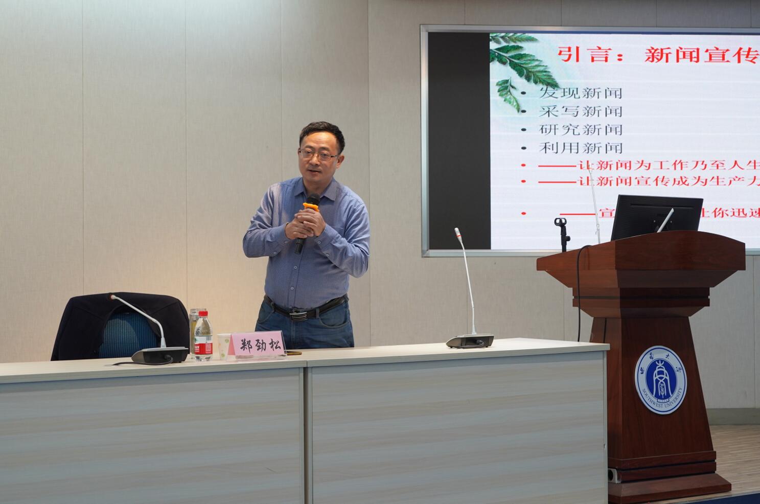 讲座伊始,郑教授讲述了他大学时期作品获奖的经历,用真实的事例论述写作对人生的重要意义。他分享了自己策划、撰写出点击量高达2.3亿新闻的成功案例,以此来论述宣传意识的重要性,并讲述了西南大学建设发展档案馆、校史馆的过程,提出了“新闻宣传也是生产力”的观点。