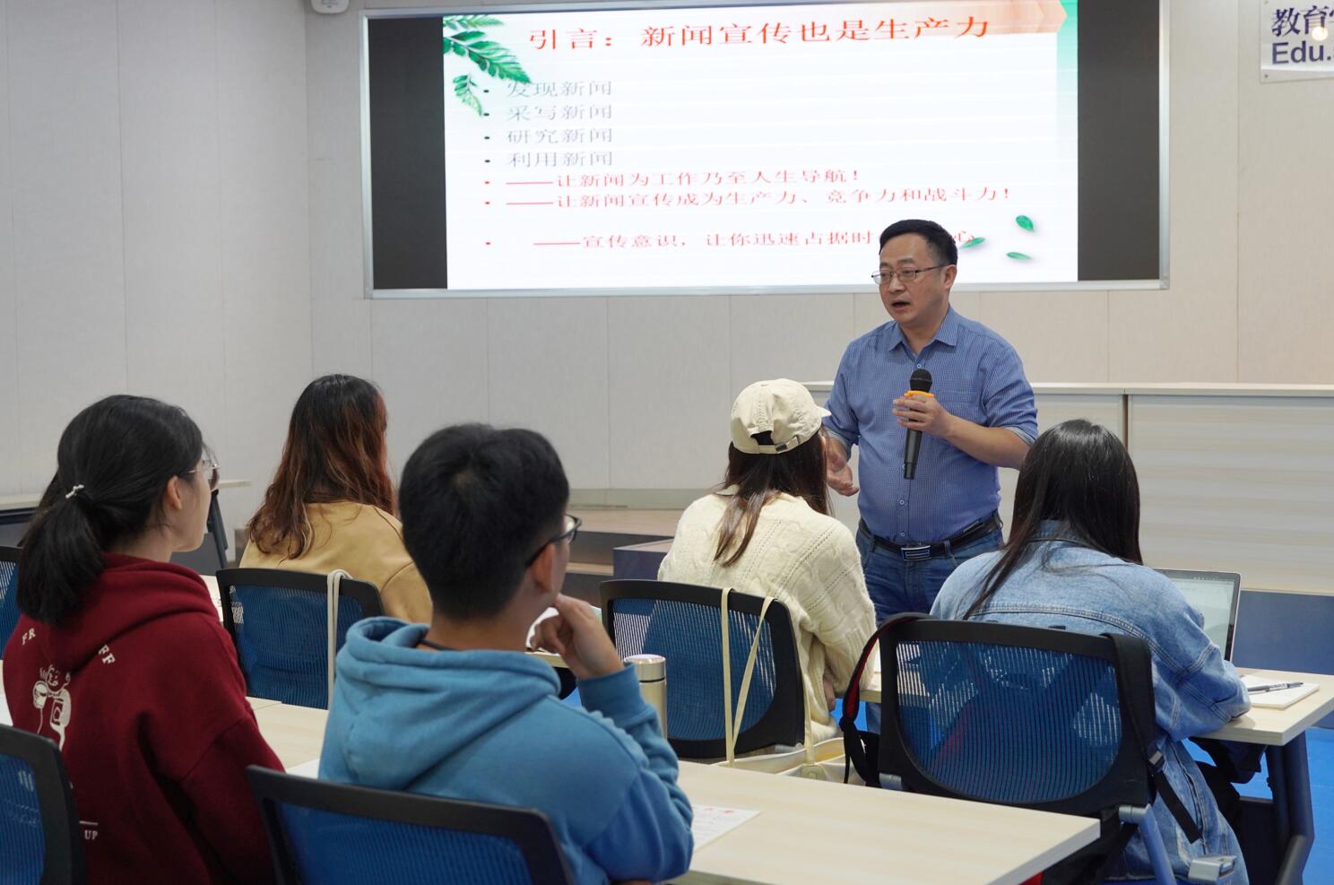 接着,郑教授以曾经策划的“蓝花楹档案行动”为例,向大家传授了将写作主题、角度做到新颖别致的经验;以曾经举办的“脱贫攻坚成就展”为例,说明写作应重视提升立意与观念的高度。“要先学会策划,要走在时代的前面”,郑教授的一席话让在场的众多同学受益良多。