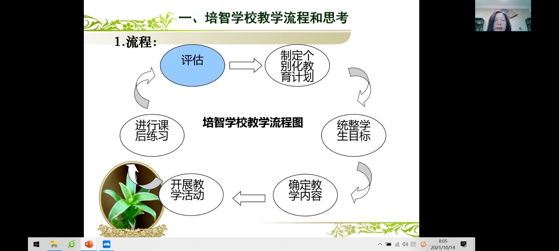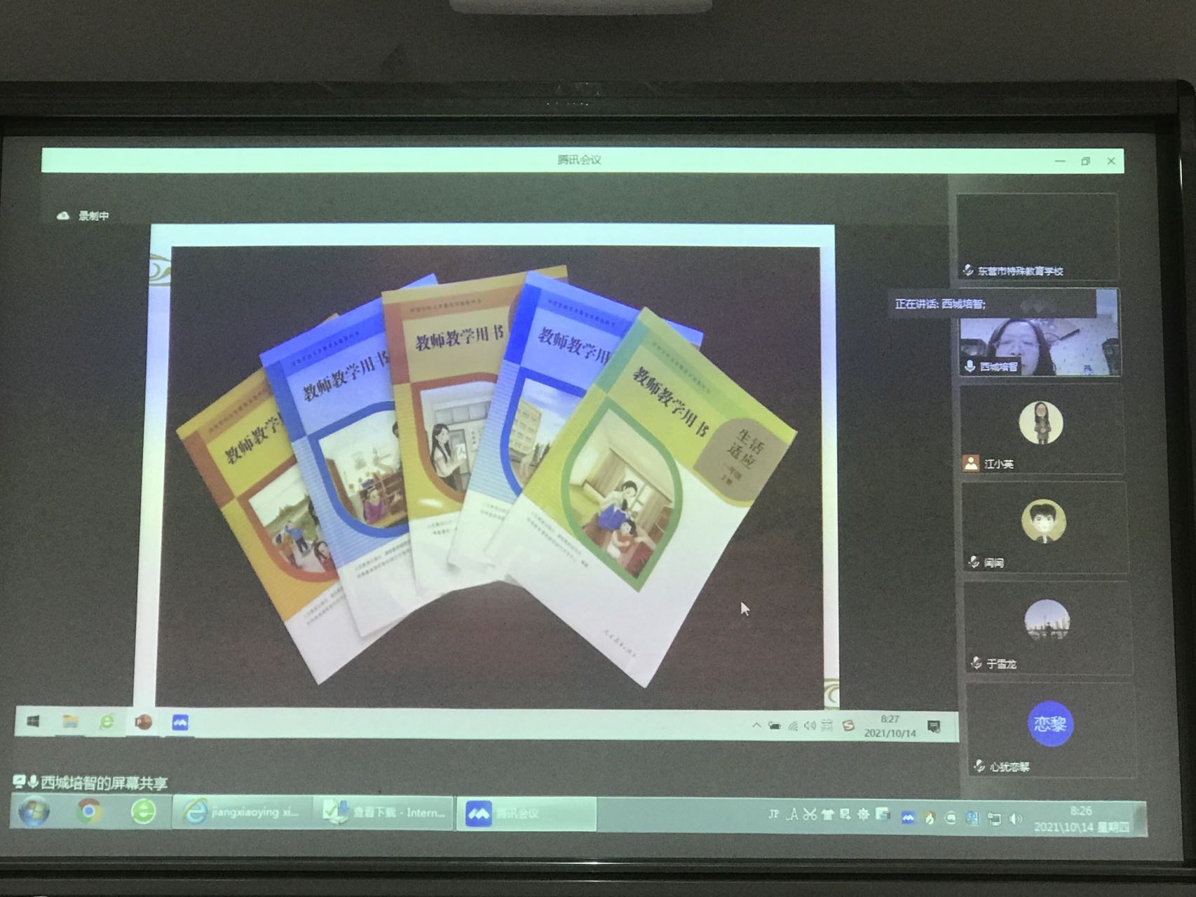 首先,程校长从培智学校教学流程讲起,主要包括评估、制定个别化教育计划和统整学生目标等步骤。提到要依托人教社教材进行课堂教学,教材编写的理念为以生活数学课标的内容为编写依据,以学生生活的基本场景为编写线索,以数与运算和形与空间为编写主体,让学生形成初步的计算、思维和运用能力。教材编写的过程包括:调研、知识分解、分配任务、明确问题、提出修改、试教试学、教材送审和正式出版等几个部分。