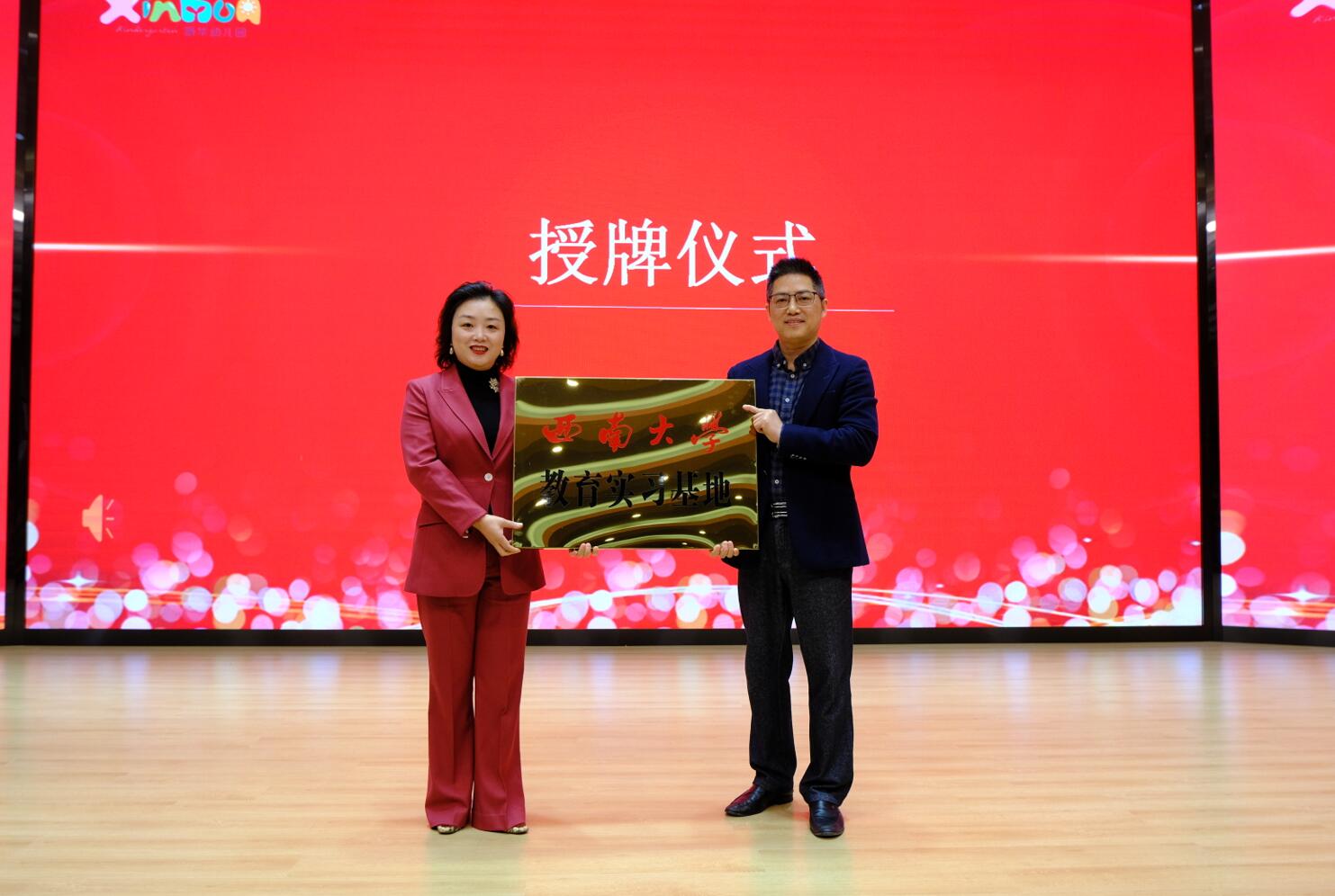 随后,杨锐园长从胥兴春副院长手中接过了西南大学教育实习基地的牌匾,双方共举铭牌合影留念,标志着合作关系的正式确立。