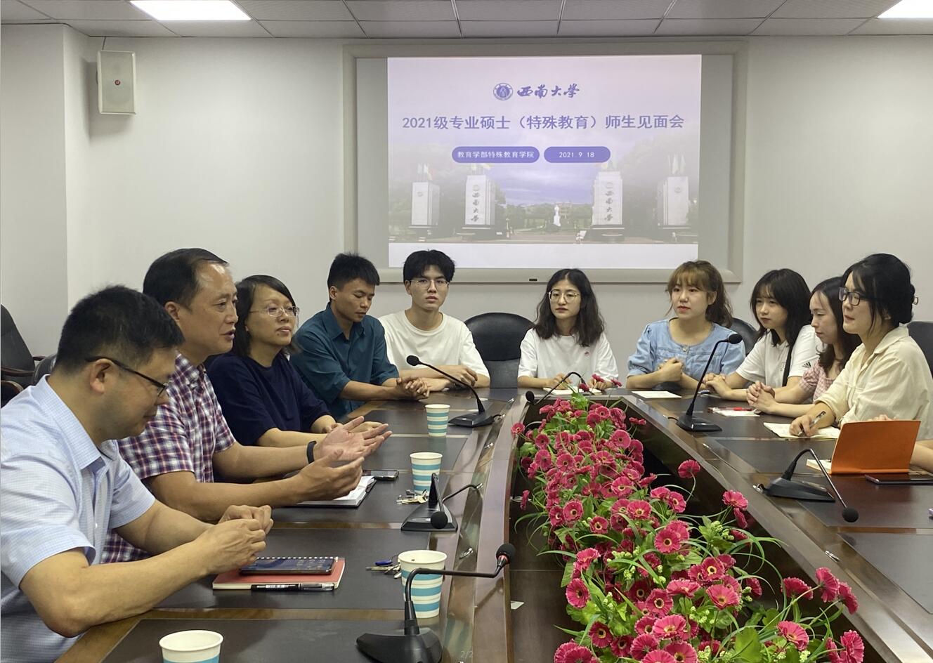 2021年9月18日下午,特殊教育专业2021级研究生师生见面会在必赢3003no1线路检测中心403会议室顺利举行。会议由特殊教育学院院长赵斌老师主持,副院长李欢老师、杨柳副教授、阳泽副教授及2021级研究生新生出席见面会。