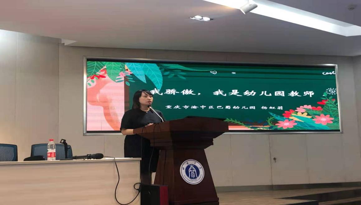 随后,学前教育专业优秀校友、重庆市渝中区巴蜀幼儿园副园长杨虹莉老师分享了自己从学前教育专业毕业后作为一名幼儿园教师的职业经历,为大家讲述了作为一名幼儿教师的光荣和幸福。首先,杨园长认为,国家教育行政部门高度重视和大力发展学前教育事业,列举了国家教育部门出台的一系列学前教育的制度文件,并对《幼儿园教育指导纲要》、《幼儿教师专业标准》和《关于学前教育深化改革规范发展的若干意见》等进行了说明。其次,杨园长指出,一名优秀的幼儿教师需要夯实综合能力,包括教育教学、环境创设、儿童观察和家园协同共育。然后,她认为学前教育专业的学习可以让同学们用更加科学和专业的态度对待儿童的成长。最后,她以“学前教育发展与我们的未来”强调了学前教育专业发展的光明前景,鼓励同学们应该用“遇见学前教育、遇见幸福”的学习理念投入到专业学习中去。杨园长经验分享结束后,同学们围绕“幼儿园教师的地位和待遇怎样、幼儿园工作是否富有挑战性”等问题请教了杨园长,杨园长对同学们的问题一一耐心细致回答,使得同学们对学前教育专业的价值有了更加清晰明确的认识,纷纷表示受益匪浅。