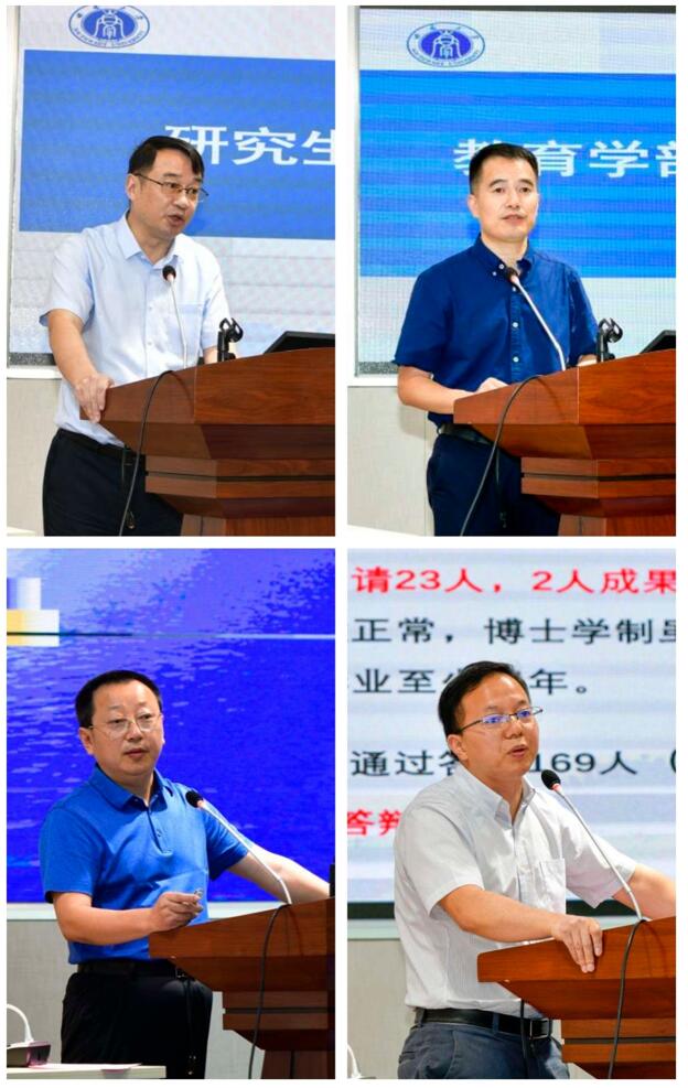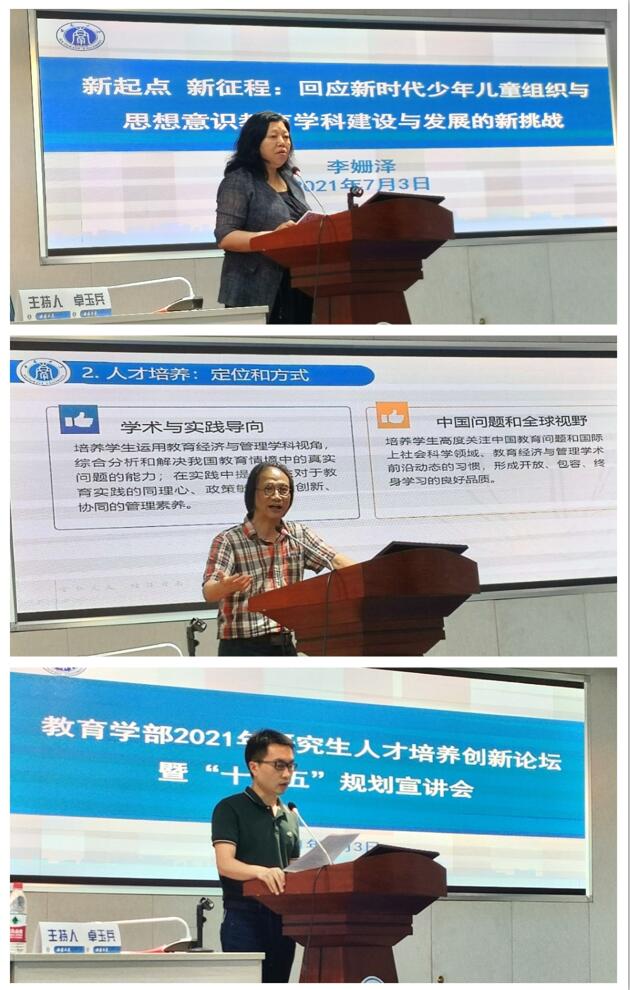 之后,学部各二级学科负责人分别就学科研究生人才培养做分享汇报。基础教育学专业负责人宋乃庆教授基对研究生人才培养提出四点建议:1.加强对基础教育学学科发展的重视;2.促进跨学科联合培养,实施主、副导师负责制;3.广泛宣传,吸引优秀生源;4.推动学科交叉与融合。课程与教学论专业汇报人赵鑫教授提出课程与教学论专业学科发展与人才培养面临瓶颈和挑战,提出需要从强化学科认同感与归属感、挖掘与利用学术资源、制定评价体系和搭建跨学科、跨学术的校内平台四个方面加强学科建设和人才培养。教育学原理专业负责人孙振东教授提出研究生人才培养要提高专业意识和学术标准,保障教育学原理研究生培养质量。他强调要让学生意识到自己的研究者身份,培养个人的专业意识,与此同时要充分发挥导师督导作用,通过实践调研等相关活动提高学术质量。教育史专业负责人谢长法教授强调入学教育作为开学第一课的重要性,提出必须要进一步完善课程设置,并对读书、学术、人生三者间的关系进行深入探讨。比较教育学专业汇报人王正青教授归纳了学科发展的历史,总结了学科发展所取得的成就,概括了该专业人才培养的相关举措,提出研究生人才培养必须进一步凝练学科方向、强化方法训练、鼓励学术交流。学前教育学专业负责人杨晓萍教授总结了学前团队的经验,指出要从资源、体制、特色工程建设和人才选拔等方面推进学科的建设。成人教育学专业负责人刘义兵教授提出成人教育专业研究生的培养目标应为:志存高远,根在田野,并从创建学科体系与话语体系、培养深厚的专业情怀、重视多元学术成果等方面描绘了专业的发展蓝图,强调要找准成人教育学在必赢3003no1线路检测中心学科体系中的定位。特殊教育学专业负责人赵斌副教授指出特殊教育作为起步最晚的专业,在生源质量和师资力量方面都存在一定困难,在专业发展上也是机遇与挑战并存,必须重视跨学科的研究,在研究生人才培养上建议要做到科研与实践相结合。教育技术学专业负责人刘革平教授对该专业的发展情况进行总结,提出研究生人才培养要从完善科研实践体系、开设混合式课程等方面加以改进。少年儿童组织与思想意识教育专业负责人李姗泽教授认为该专业作为一个新专业、新研究领域,仍处在“摸着石头过河”的发展阶段,研究生人才培养必须强化马克思主义基本理论与教育学理论的学习,鼓励学生进行深入实际的研究。教育经济与管理专业负责人张学敏教授就学科团队、人才培养等方面进行探讨,提出要以科教协同,研学育人作为未来的改进方向,不断强化学科基础。