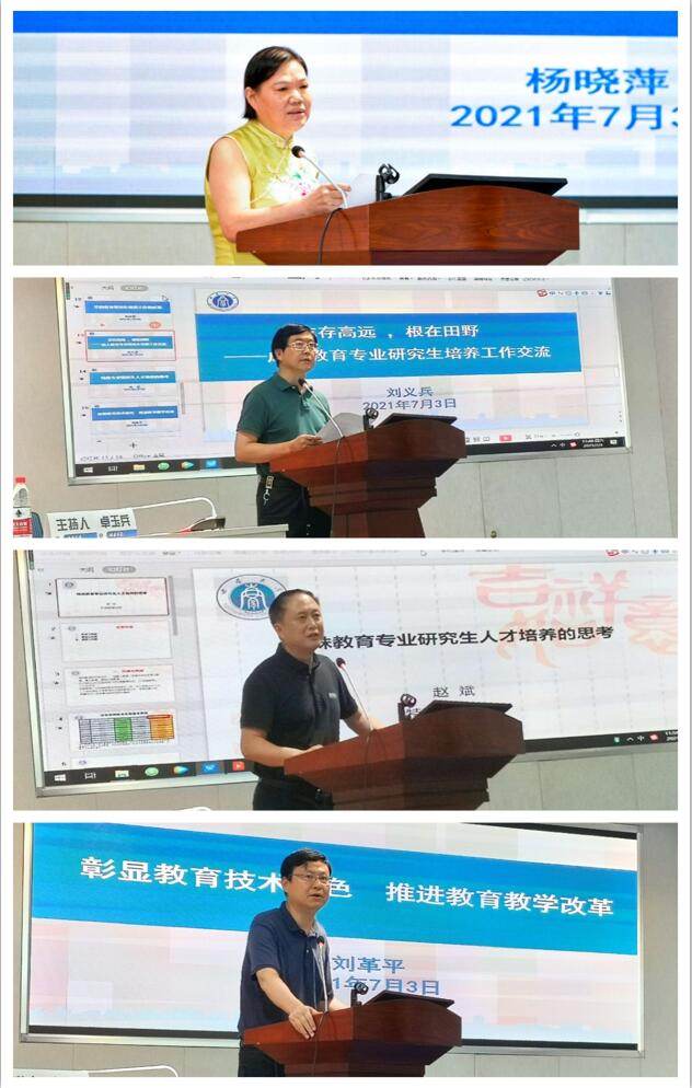 下午会议第三阶段,徐辉教授和唐智松教授作为导师代表分享研究生指导经验。徐辉教授强调研究生教育必须坚定贯彻“四个坚持”——坚持立德树人为宗旨、坚持新文科建设为导向、坚持以金课标准为原则、坚持用敬畏之心对待工作。唐智松教授就学术学位研究生和专业学位研究生培养分享经验。他认为在学术性研究生指导培养过程中要关注招生、入学、选题、研究、毕业五个关键环节,“引着走”与“推着走”并进,强调导师要用情用心。在专业硕士博士培养中要与学生保持密切交流,引导学生完成论文选题,科学设计论文框架,同时一定要注意专业学位研究生教育的实践取向。